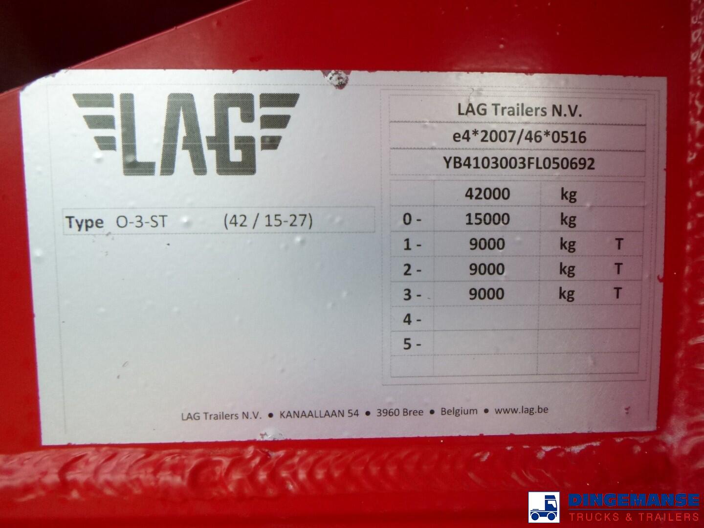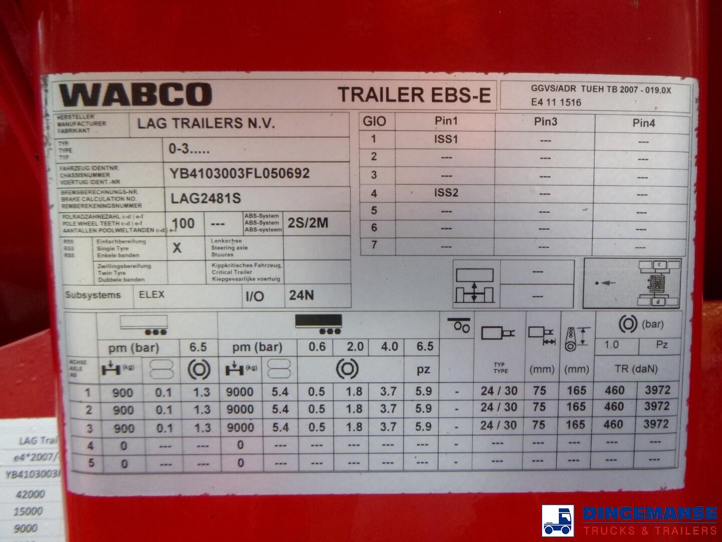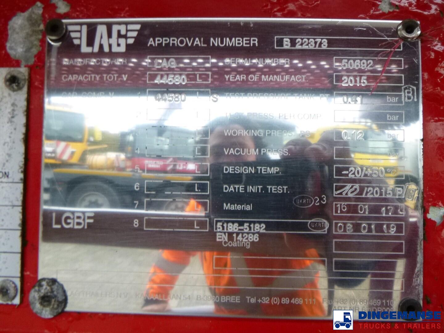 NON-EU VEHICLE, REQUIRES CUSTOMS CLEARANCE // L.A.G. aluminium jet fuel tank, Capacity 44550 liters, 1 Compartment, Year of construction 2015, Tank material code 5186-5182 / EN 14286, Test pressure 0.41 bar, Max working pressure 0.12 bar, Hydraulic discharge pump Blackmer, Vapour recovery, Overload sensor, Air suspension, Drum brakes, BPw Eco Plus axles, Alloy wheels, ABS, Shipment dimensions 1230x250x360 cm.