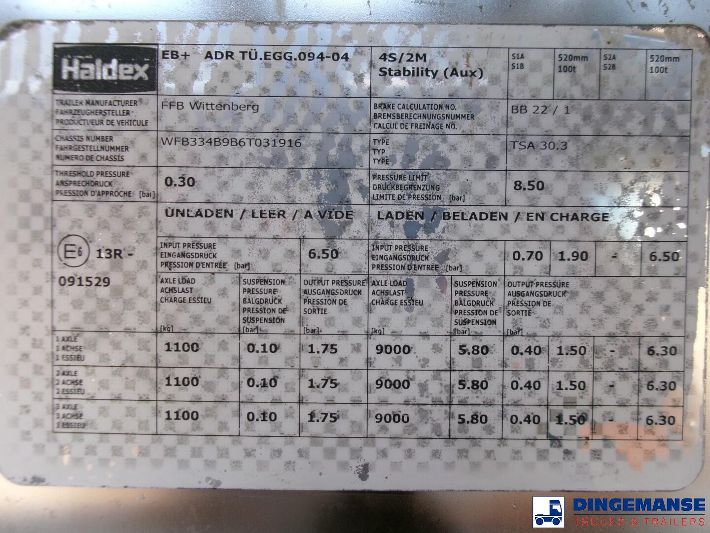 Insulated Chemical tank inox (stainless steel) L4BH tank, Capacity 30000 liters, 1 Compartment, Steam heating, Max working pressure 2.6 bar, Test pressure 4.0 bar, Tank material code 1.4571, Blackmer hydraulic discharge pump, Alloy wheels, ABS, Air suspension, Disc brakes, BPW Eco Plus axles, Shipment dimensions 1150x250x350 cm