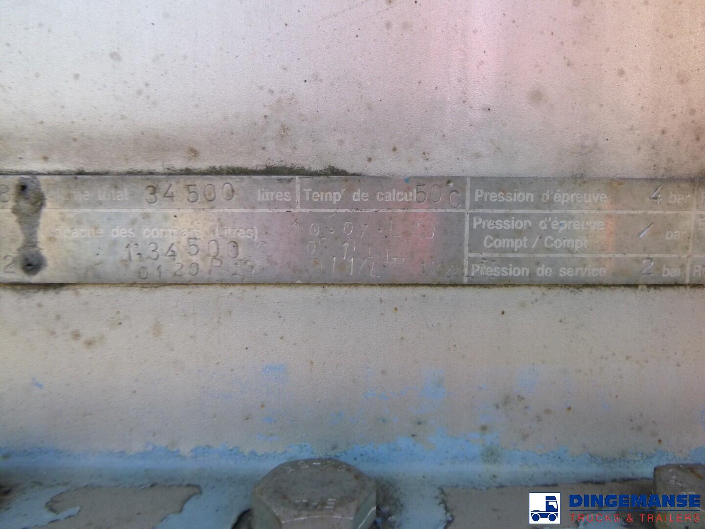 Stainless steel (inox) chemical tank, Capacity 34500 liters, 1 Compartment, Tank material code Z6 CNDT 17.12, Year of construction 1998, Test pressure 4.0 bar, Max working pressure 2.0 bar, Air suspension, ABS, Alloy wheels, SAF axles, Drum brakes, Shipment dimensions 1140x255x360 cm