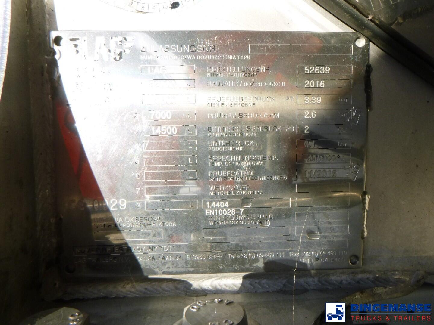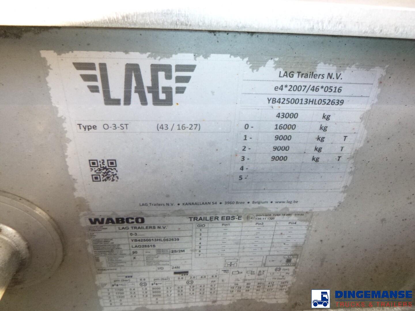 L.A.G. insulated Food tank (inox) 32000 liters, 3 Compartments (10500;7000;14500), Insulated stainless steel, Test pressure 2.6 bar, Max working pressure 2.0 bar, Steam and liquid heating, Pump, Diesel generator for independent heating, Year of construction 2016, Air suspension, BPW axles, Disc brakes, ABS, Alloy and steel wheels, Shipment dimensions 1160x250x370 cm