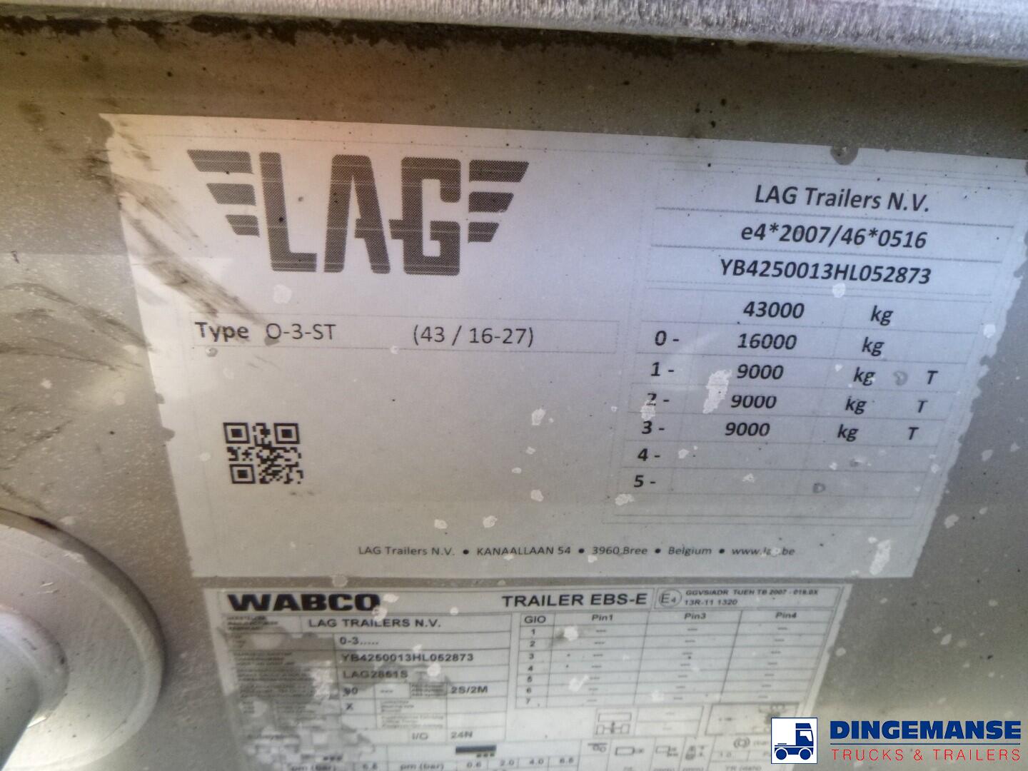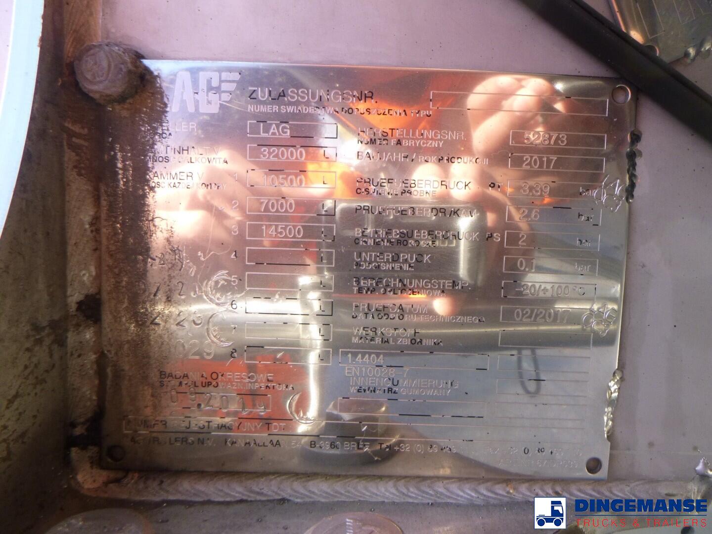 L.A.G. insulated Food tank (inox) 32000 liters, 3 Compartments (10500;7000;14500), Insulated stainless steel, Test pressure 2.6 bar, Max working pressure 2.0 bar, Pump, Steam Heating and WEBASTO (liquid heating),  Diesel generator for independent heating, Year of construction 2017, Air suspension, BPW axles, Disc brakes, ABS, Alloy wheels, Shipment dimensions 1160x250x370 cm