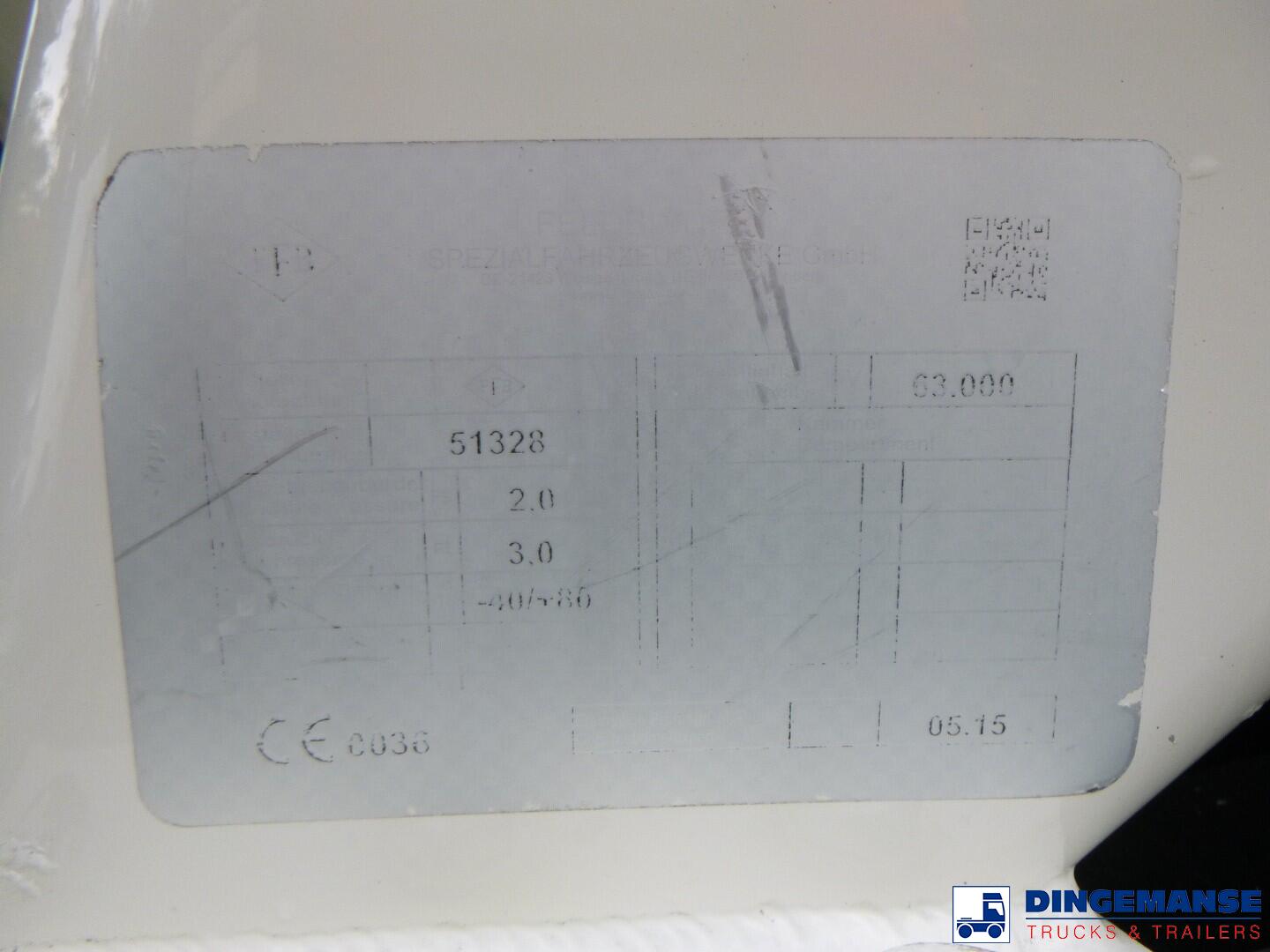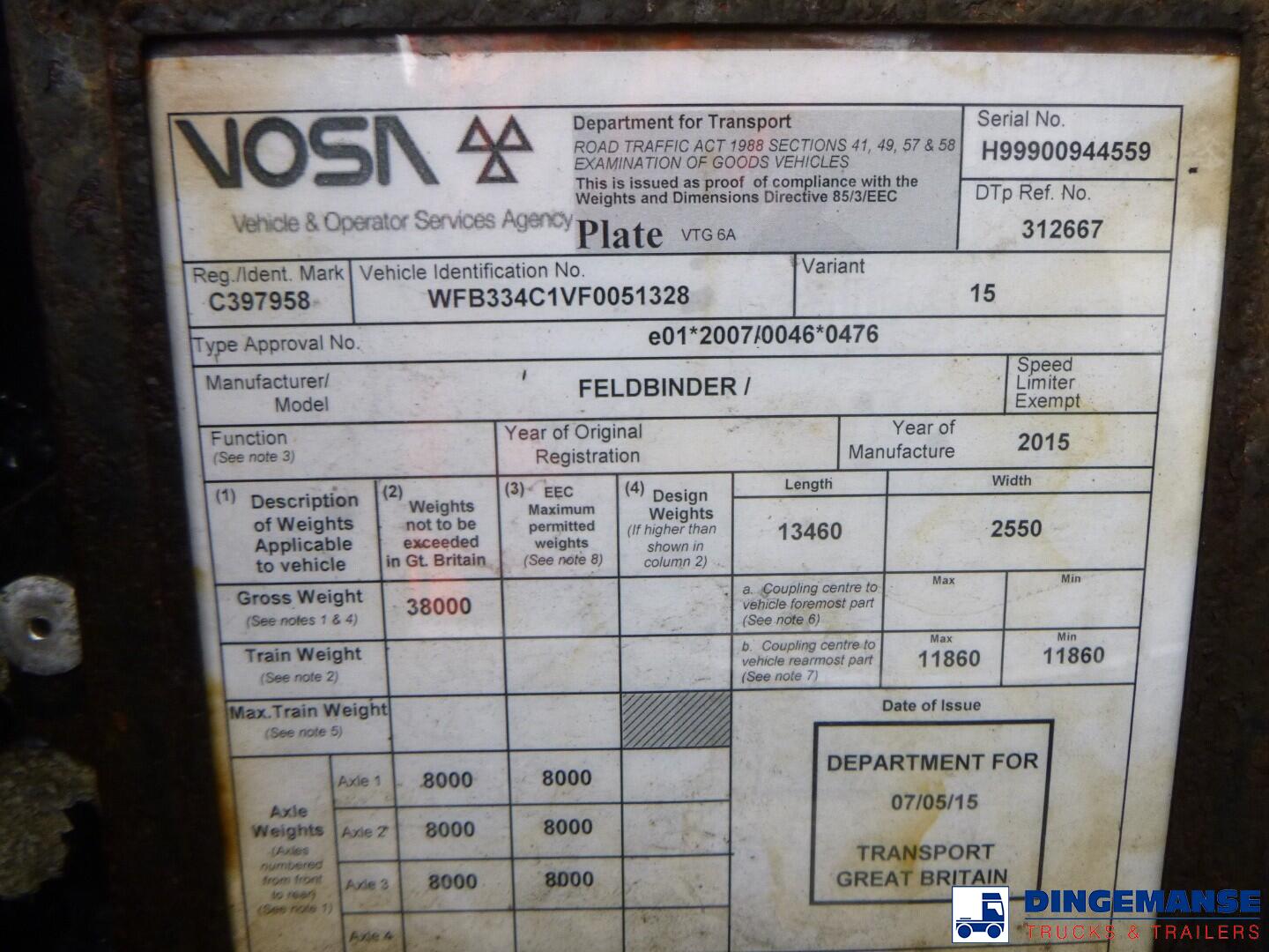 NON DUTY FREE VEHICLE, REQUIRES CUSTOMS CLEARANCE // Aluminium powder tank with hydraulic tipping system, Capacity 63000 liters, 1 Compartment, Year of construction 2015, Test pressure 3.0 bar, Max working pressure 2.0 bar, Air suspension, BPW Eco Plus axles, Drum brakes, Alloy wheels, ABS, Shipment dimensions 1340x250x360 cm