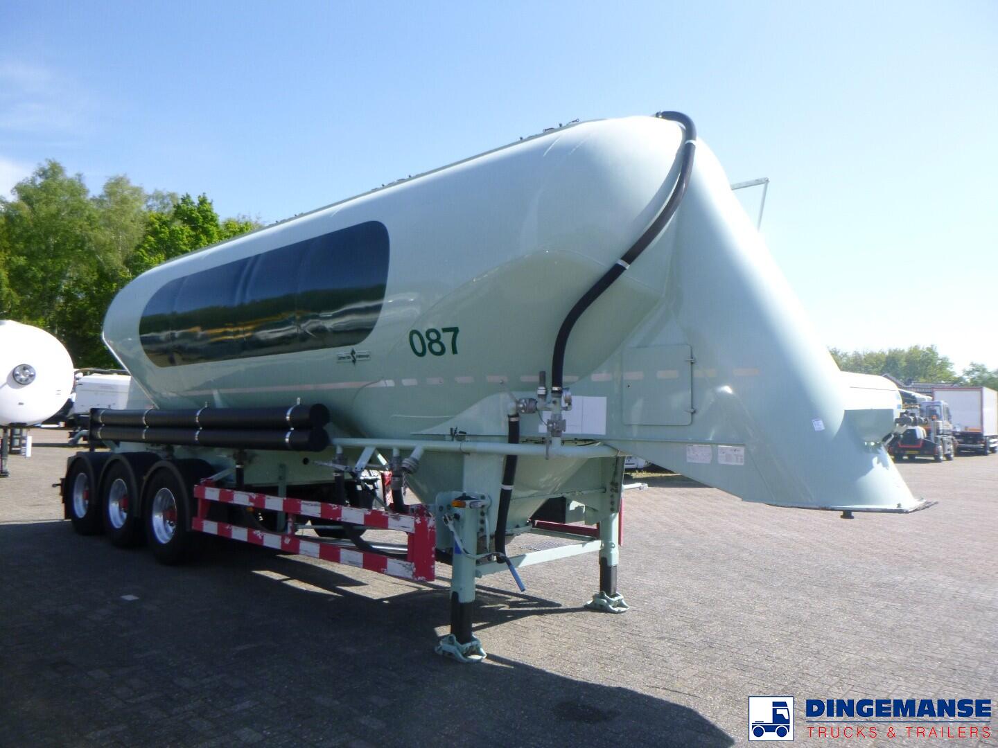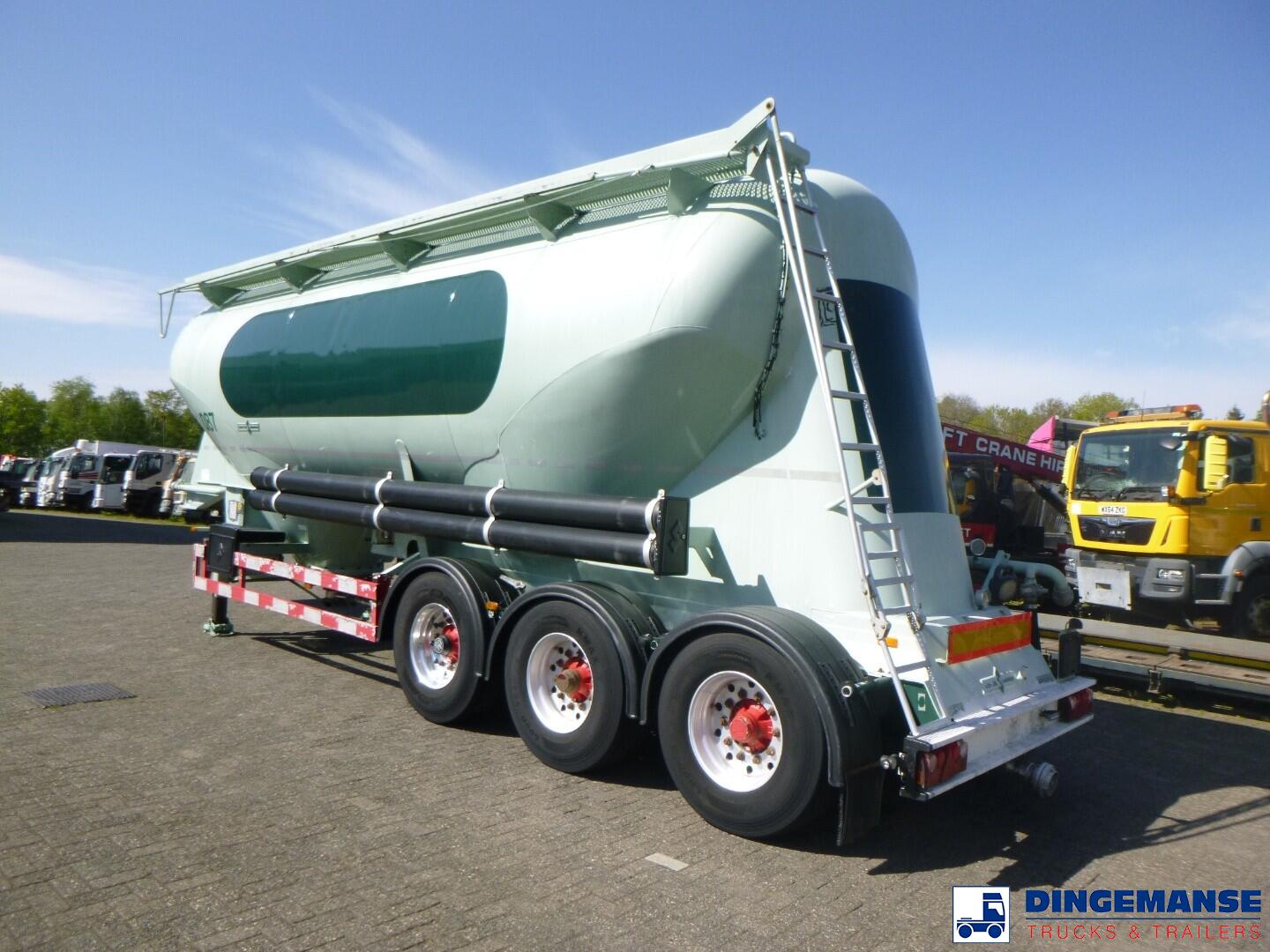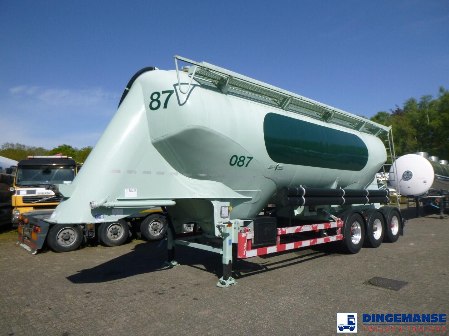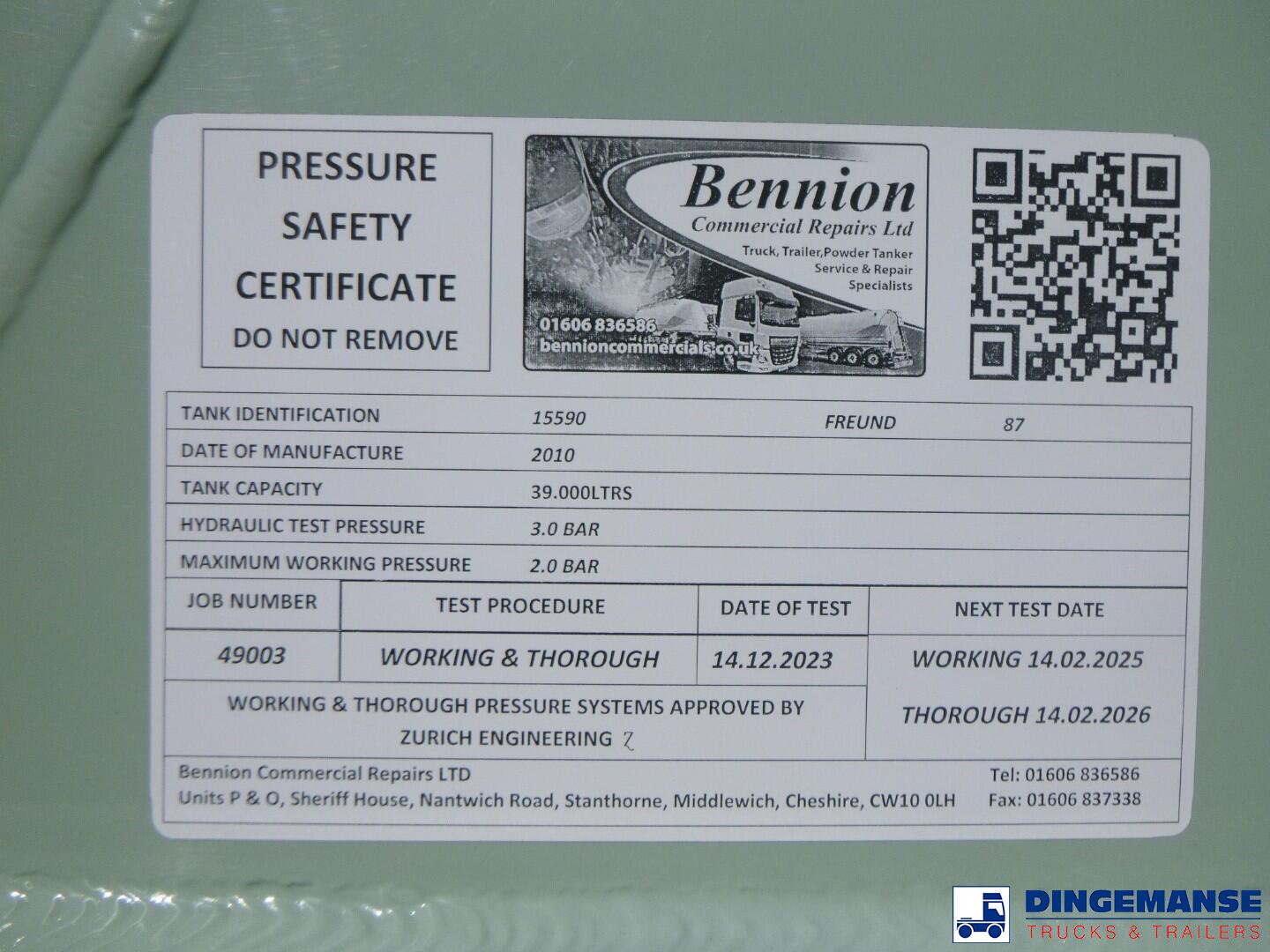 Aluminium powder tank (cement silo), capacity 39000 liters, 1 compartment, Year of construction 2010, Test pressure 3.0 bar, Max working pressure 2.0 bar, Air suspension, lift axle(1st), BPW Eco axles, Disc brakes, ABS, Alloy wheels, Shipment dimensions 1070x250x370 cm.