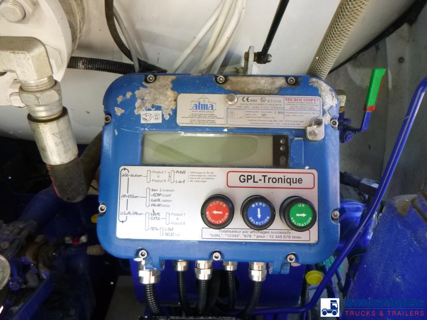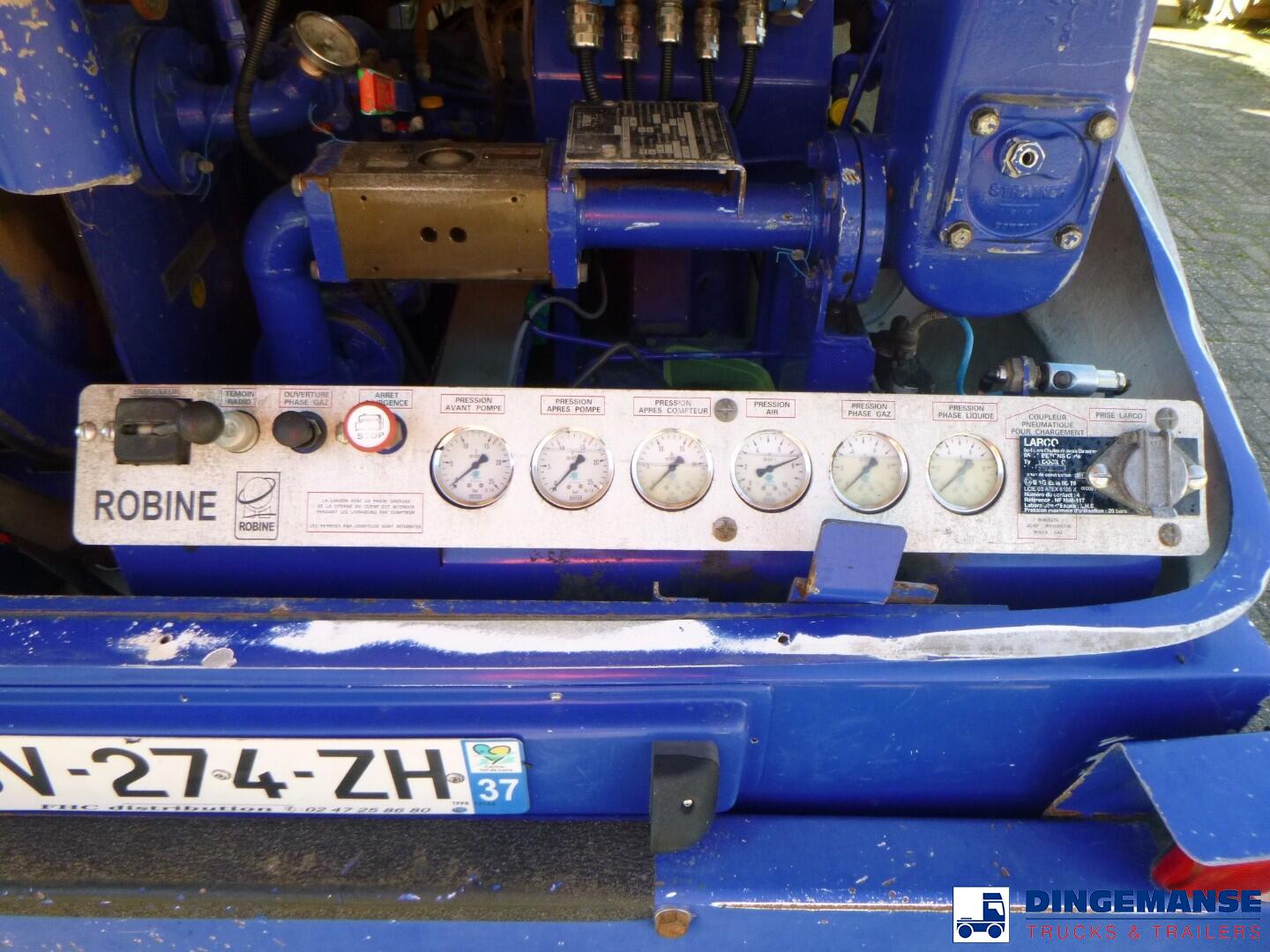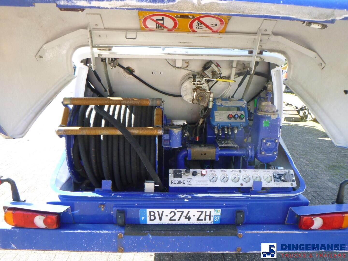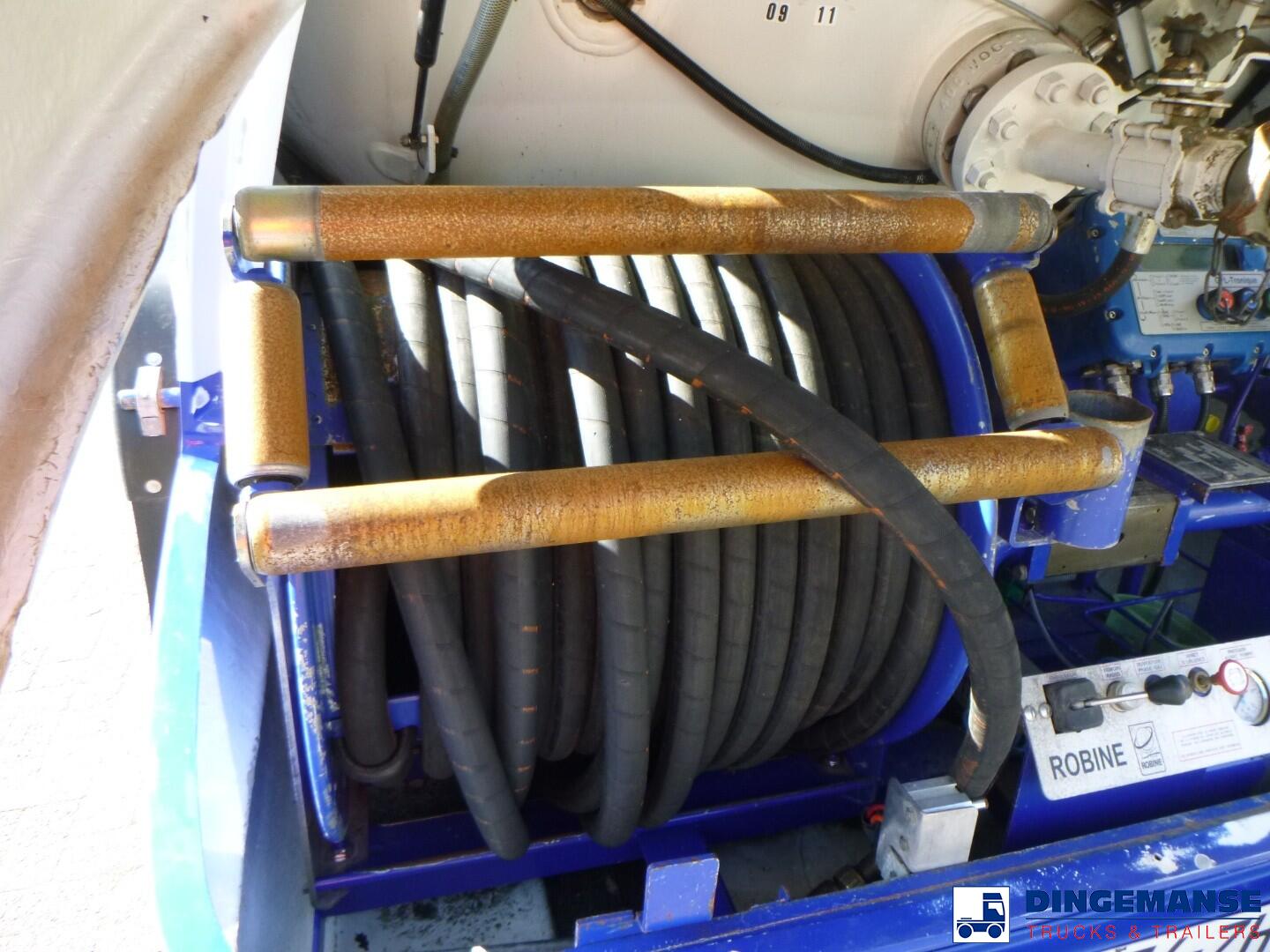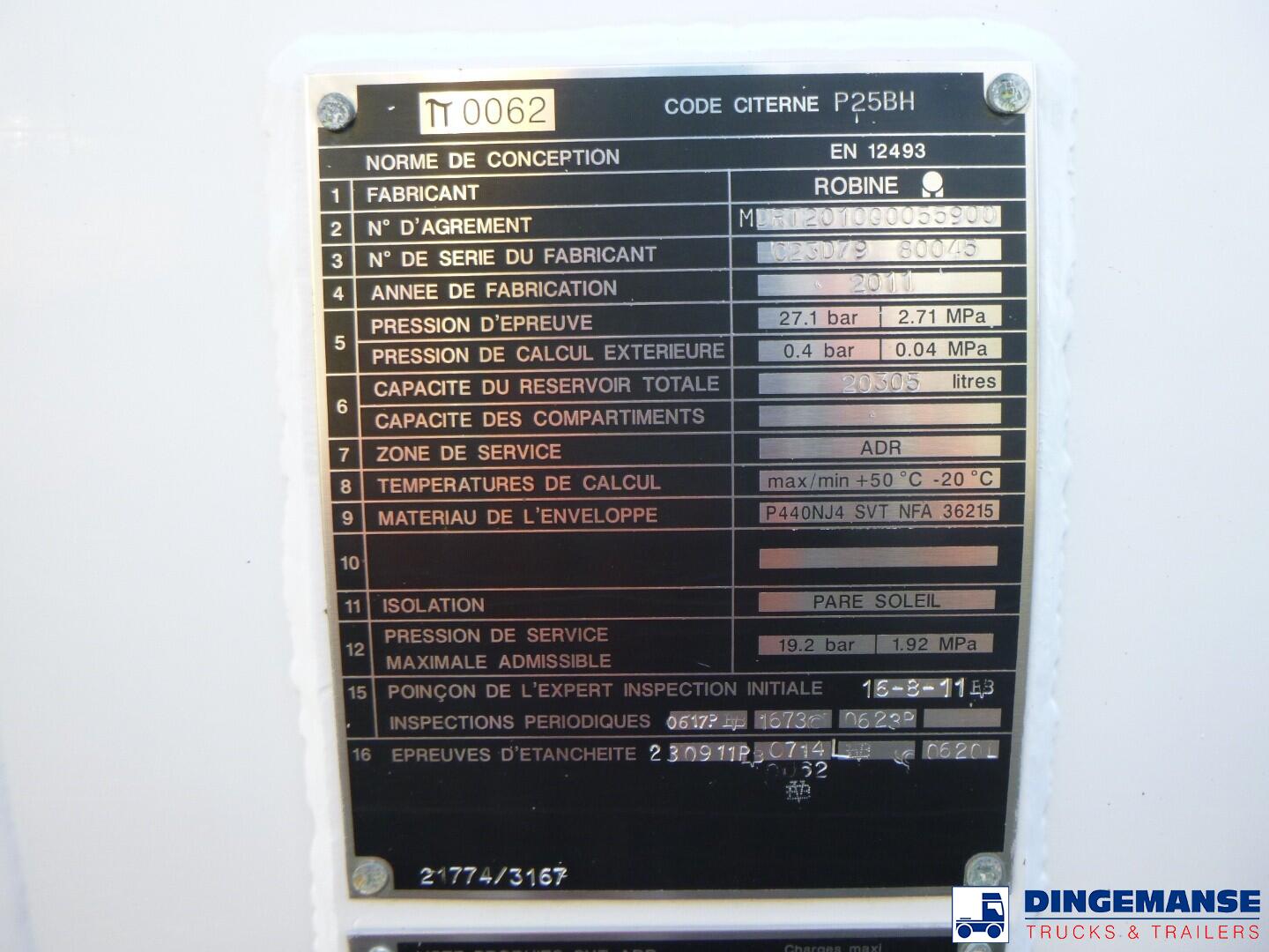 Robine steel gas (LPG) tank, Capacity 20305 liters, 1 Compartment, Year of construction 2011, Tank material code P440NJ4, Test pressure 27.1 bar, Max working pressure 19.2 bar, Hose reel, Hydraulic pump, Digital counter // Truck 4x2, euro 5, Adblue, Manual gearbox, Diff lock, Steel front suspension, Air rear suspension, Day cabin, airconditioning, Digital tachograph, Shipment dimensions 780x250x340 cm