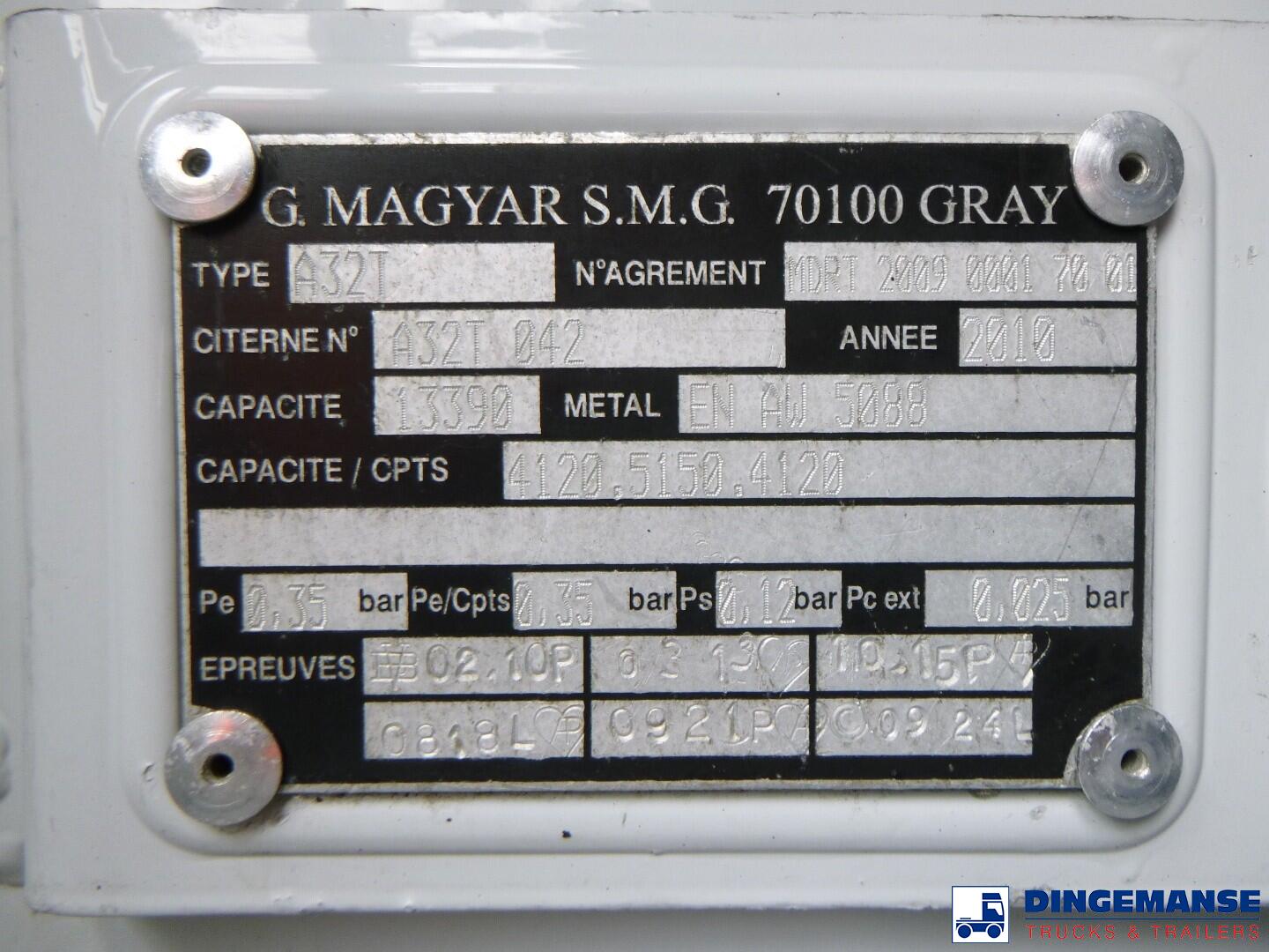 Magyar aluminium fuel tank, Capacity 13390 liters, 3 Compartments (4120;5150;4120 / 4000;5000;4000 liters), Year of construcion 2010, Tank material code EN AW 5088, Test pressure 0.35 bar, Max working pressure 0.12 bar, Hydraulic pump, Digital counter, Overload sensor, Vapour recovery // Truck 4x2, Euro 5, Manual gearbox with 8 gears (4 low, 4 high), Diff lock, Steel front suspensions, Air rear suspension, Alloy wheels, Day cabin, Airconditioning, Digital tachograph, Shipment dimensions 715x250x340 cm