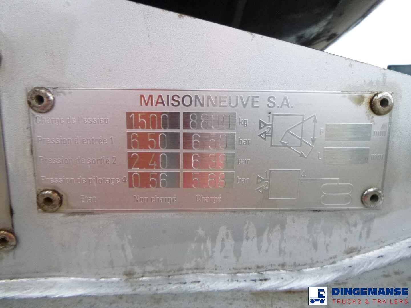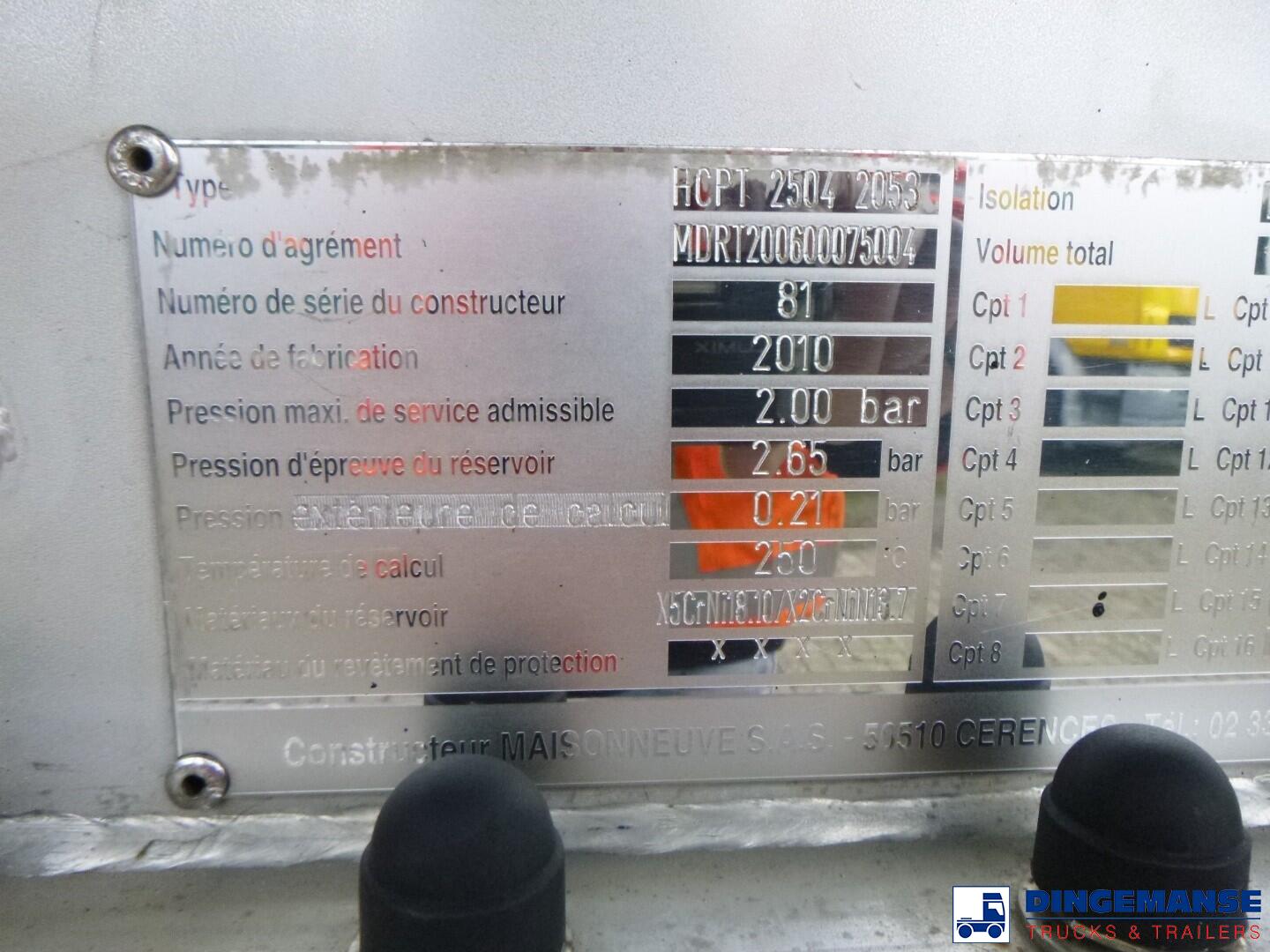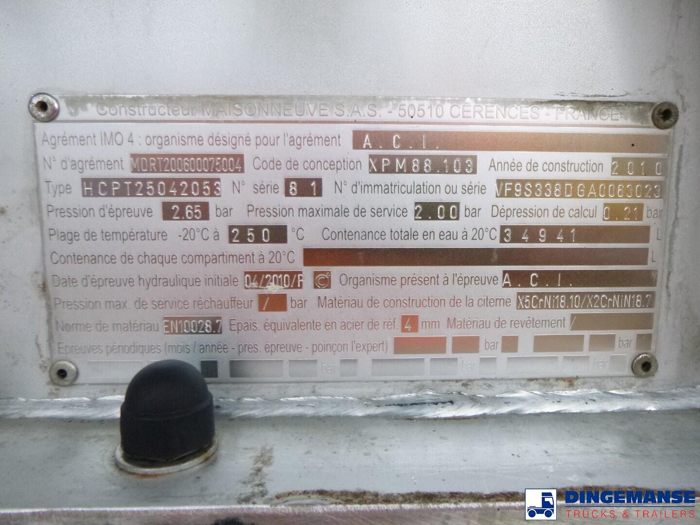 Maisonneuve insulated stainless steel bitumen tank, Capacity 34941 liter, 1 Compartment, Tank material code  EN10028.7, Test pressure 2.65 bar, Max working pressure 2.0 bar, Year of construction 2010, Air suspension, Disc brakes, Alloy wheels, ABS, Mercedes axles, Lifft axle, Shipment dimensions 1180x250x360 cm