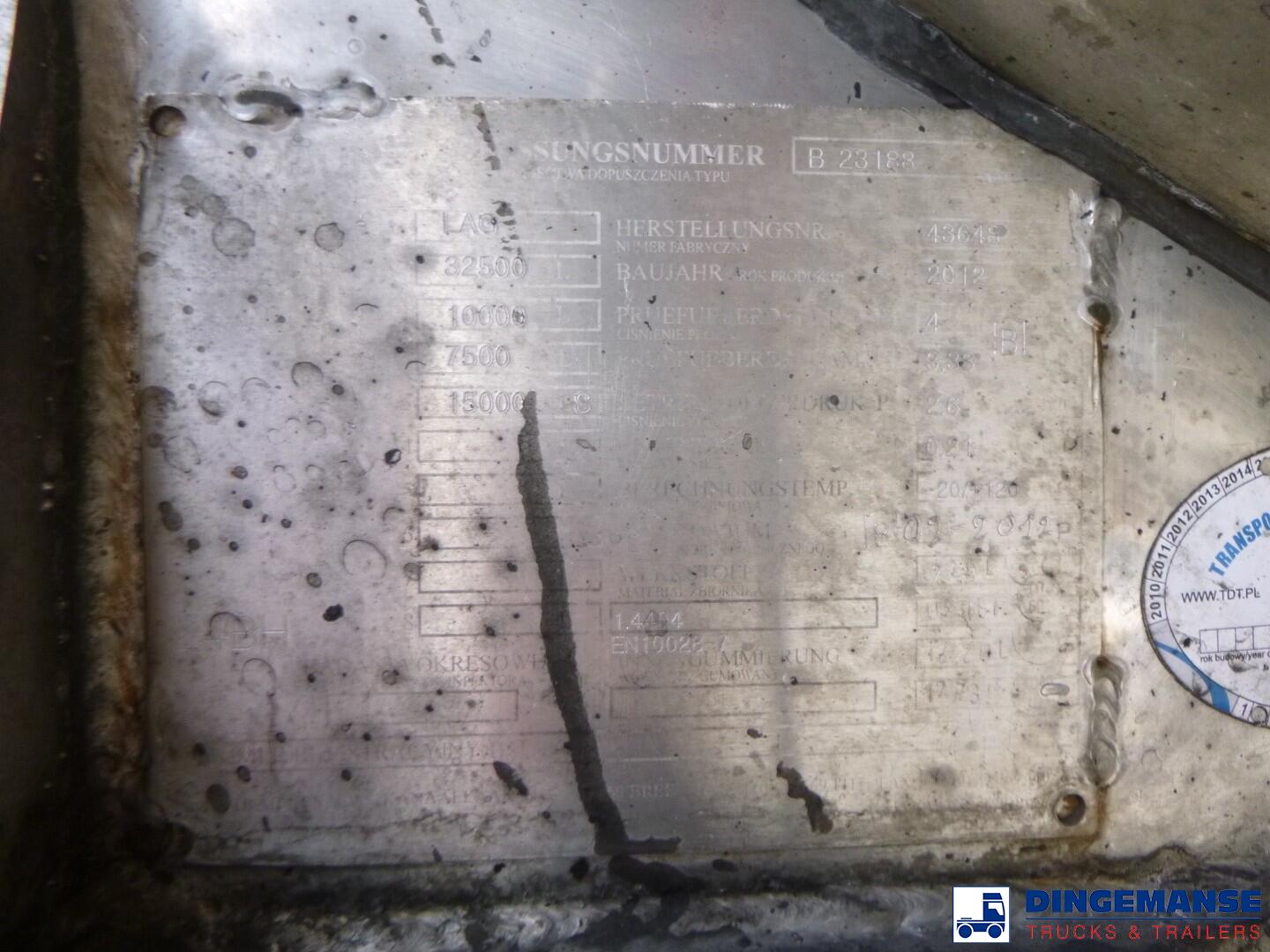 Stainless steel insulated chemical tank, Capacity 32500 liters, 3 Compartments (10000; 7500; 15000), Year of construction 2012, Steam heating, Test pressure 4.0 bar, Max working pressure 2.6 bar, Tank material code 1.4404 EN 10028-7, Air suspension, Disc brakes, BPW Eco Plus axles, ABS, Alloy wheels, Shipment dimensions 1160x250x360 cm
