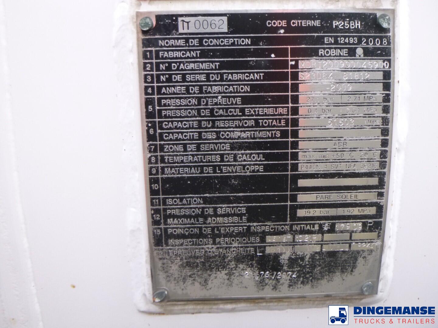 Robine steel gas (LPG) tank, capacity 51503 liter, 1 Compartment, Test pressure 25 bar, Max working pressure 19.3 bar, Year of construction 2009, Tank material code: P25BH // P 440 NJ4 NFA 36215, Air suspension, lift axle, Alloy wheels, ABS, Disc brakes, Mercedes axles, Shipment dimensions 1300x250x350 cm