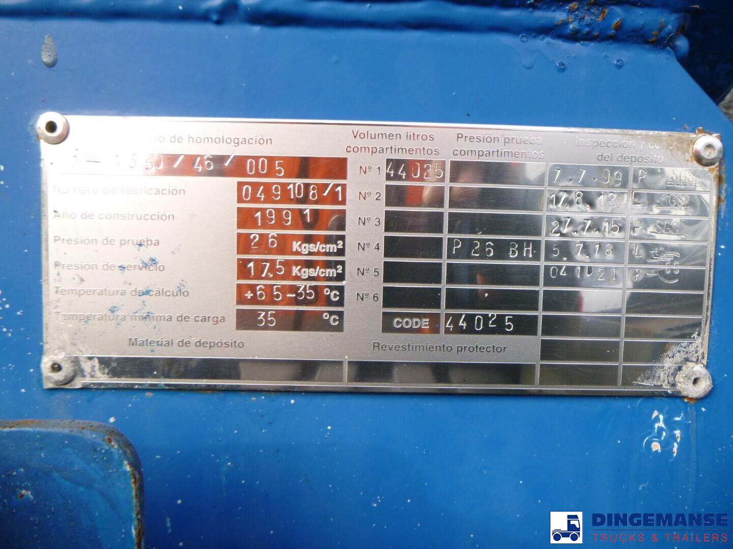 Steel gas (LPG) tank, Capacity 44025 liters, 1 compartment, Test pressure 26.0 bar, Max working pressure 17.5 bar, Year of construction 1991, Spring suspension, Drum brakes, BPW axles, ABS, Shipment dimensions 1260x250x370 cm