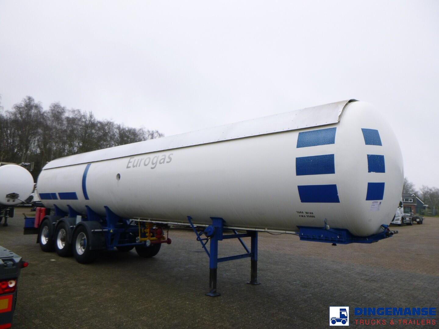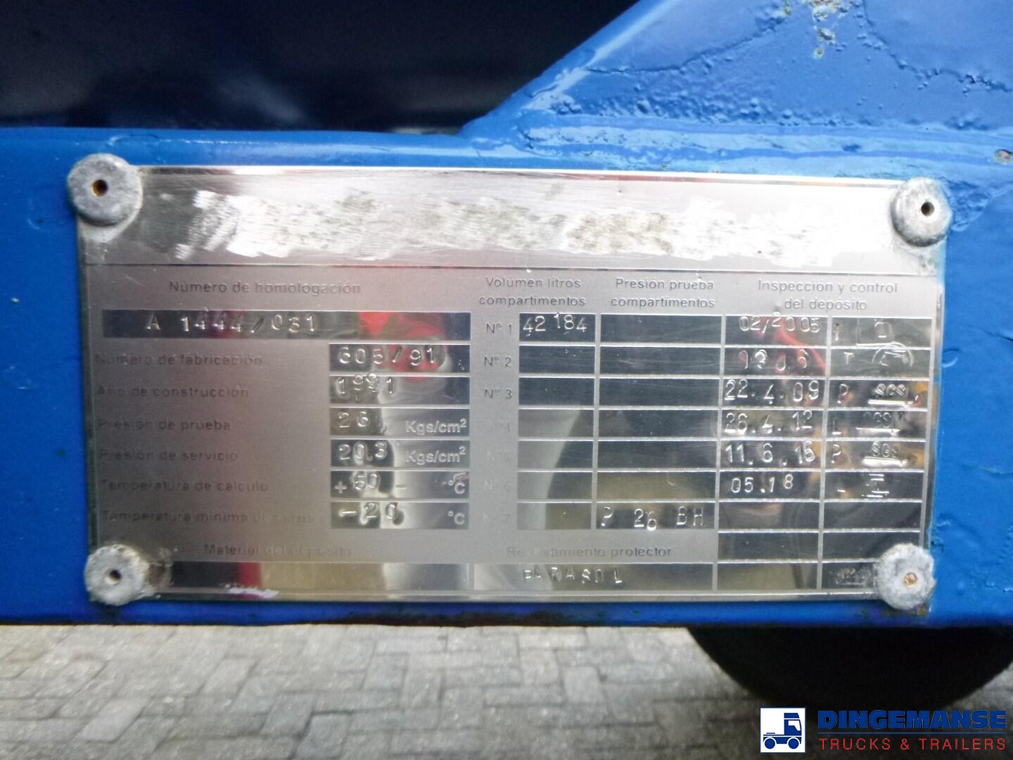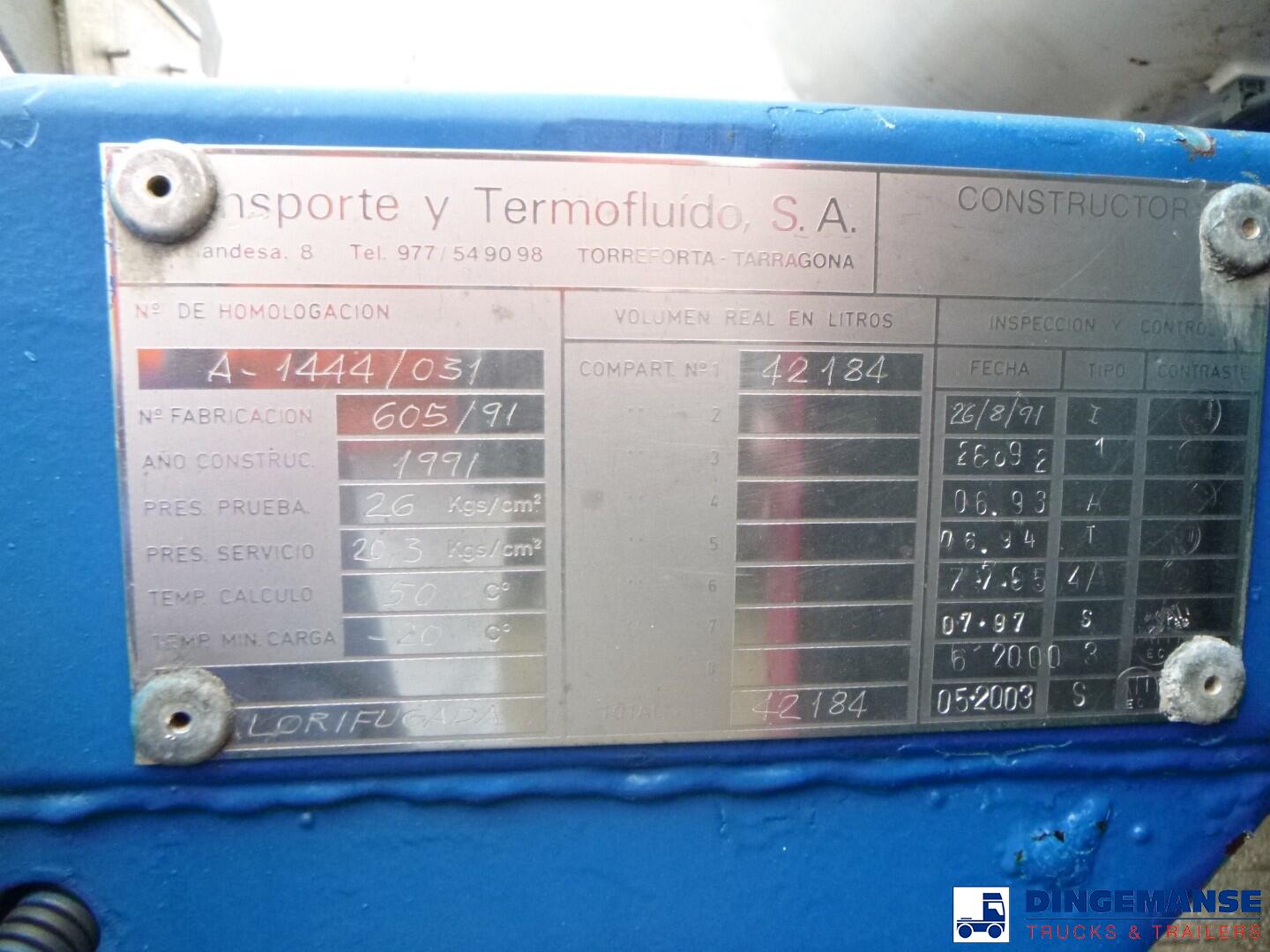Steel gas (LPG) tank, Capacity 42184 liters, 1 compartment, Test pressure 26.0 bar, Max working pressure 20.3 bar, Year of construction 1991, Spring suspension, Drum brakes, Fruehauf axles, ABS, Alloy wheels, Shipment dimensions 1200x250x370 cm