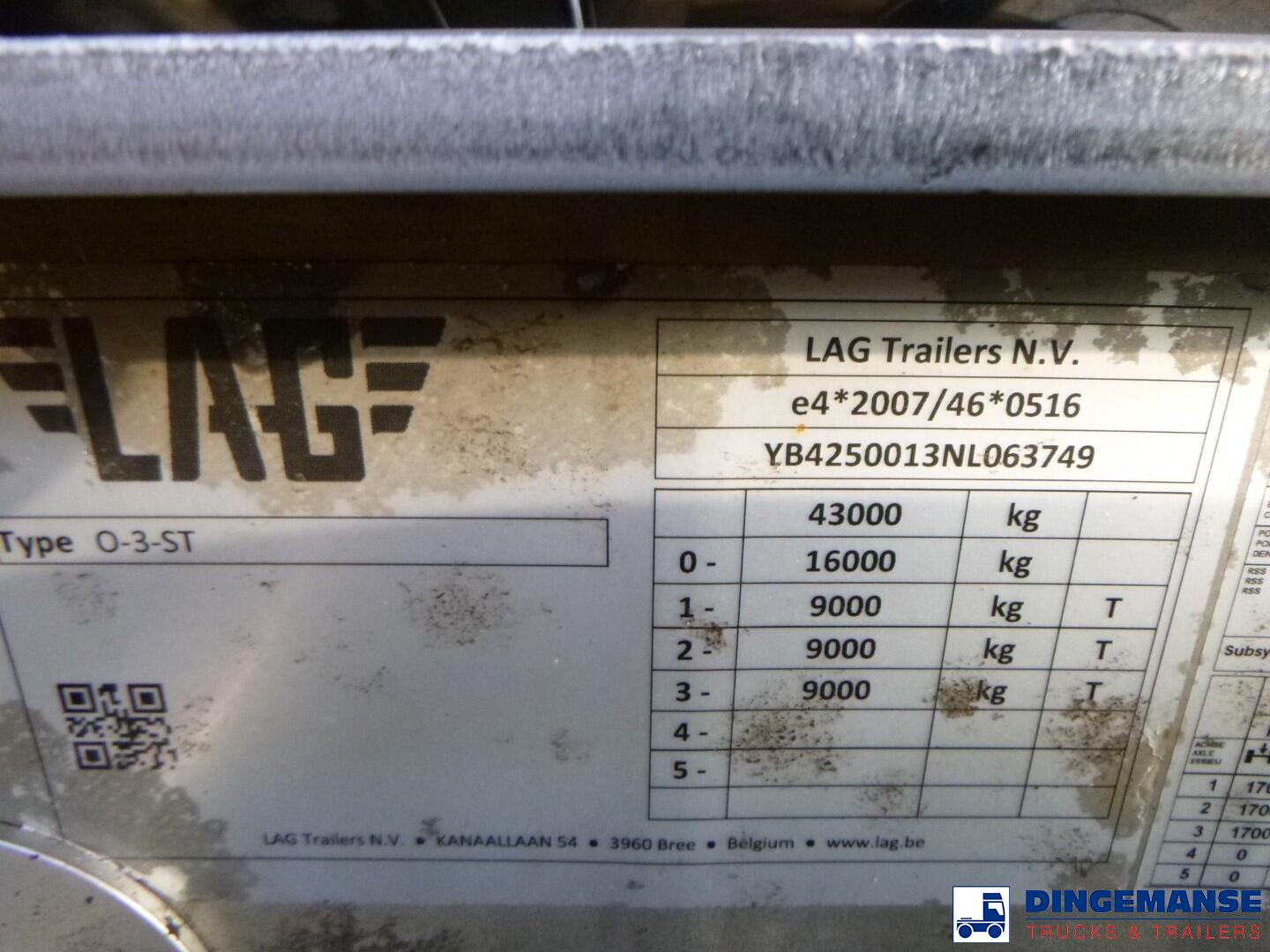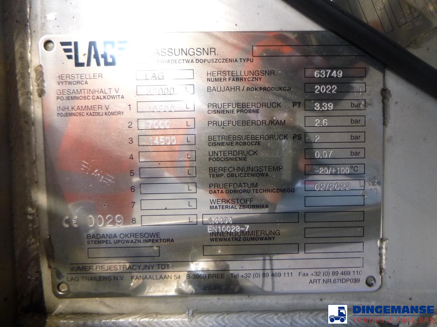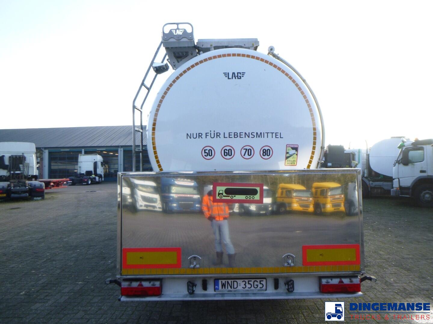 L.A.G. insulated Food tank (inox) 32000 liters, 3 Compartments (10500;7000;14500), Insulated stainless steel, Test pressure 3.39 bar, Max working pressure 2.0 bar, Pump, Steam Heating and WEBASTO (liquid heating), Diesel generator for independent heating, Year of construction 2022, Air suspension, BPW axles, Disc brakes, ABS, Alloy wheels, Shipment dimensions 1160x250x370 cm