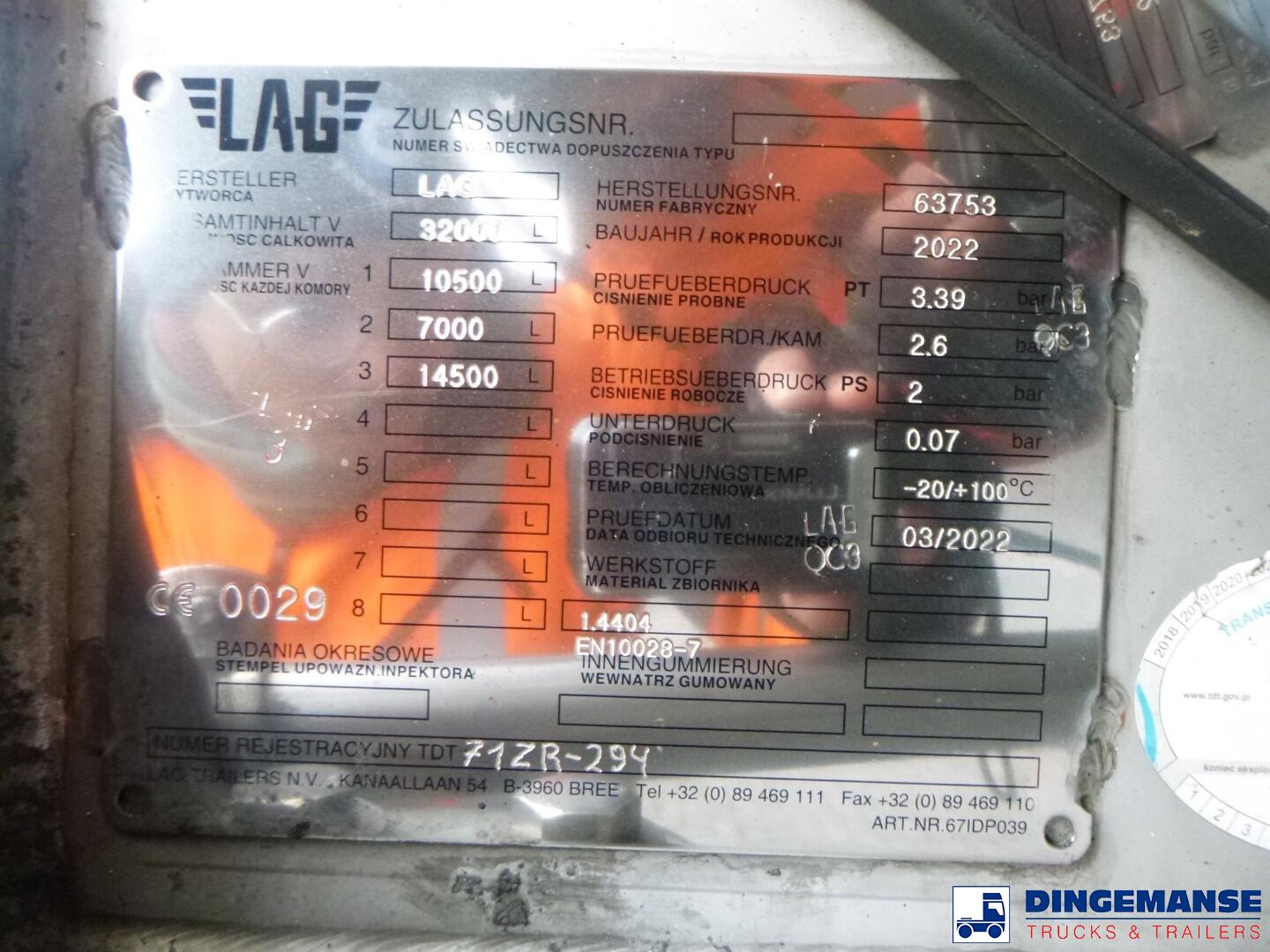 L.A.G. insulated Food tank (inox) 32000 liters, 3 Compartments (10500;7000;14500), Insulated stainless steel, Test pressure 3.39 bar, Max working pressure 2.0 bar, Pump Unibloc with Electric engine, Steam Heating and WEBASTO (liquid heating), Diesel generator for independent heating, Year of construction 2022, Air suspension, BPW axles, Disc brakes, ABS, Alloy wheels, Shipment dimensions 1160x250x370 cm