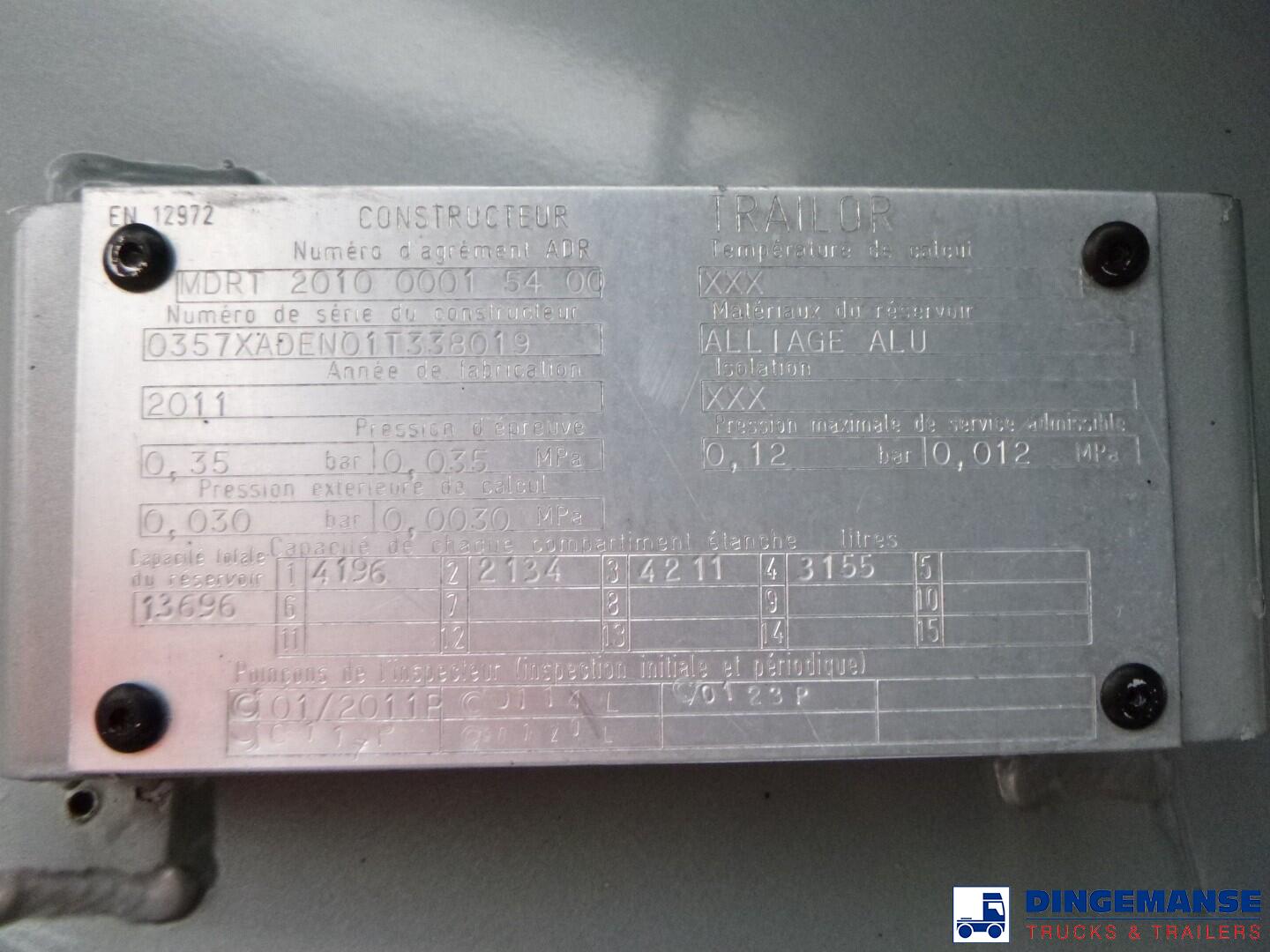 Trailor aluminium fuel tank, Capacity 13000 / 13696 liters, 4 Compartments (4000;2000;4000;3000 (nominal) / 4196;2134;4211;3155 (netto), Year of construction 2011, Hydraulic pump, Digital counter, Hose reel // Truck 4x2, Euro 5, Adblue, Manual gearbox with 8 gears, Diff lock, Dxi engine, Steel front suspension, Air rear suspension, Day cabin, Digital tachograph, Shipment dimensions 725x250x350 cm